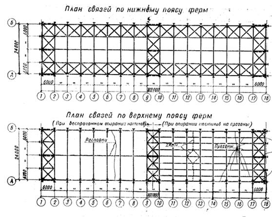 По верхнім поясам стропильних ферм влаштовують тільки поперечні горизонтальні в’язі у торцях цеху і в середині на відстані 50-60м одні від інших. По нижнім поясам стропильних ферм влаштовують як поперечні, так і поздовжні горизонтальні в’язі. Поперечні в’язі повинні розташовуватись між тими ж цифровими розбивочними осями, що і в’язі по верхнім поясам стропильних ферм. Поздовжні в’язі влаштовують за всією довжиною цеху уздовж поздовжніх рядів колон.