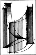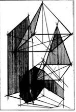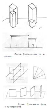 При измерении соотношений трех типовых состояний объемно-пространственной формы обнаруживается возможность перехода от объема к плоскости, от плоскости к линии.