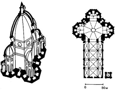 Рис. 1. Флорентийский собор Санта Мария дель Фиоре. 1434 г. Аксонометрический разрез купола, план собора.