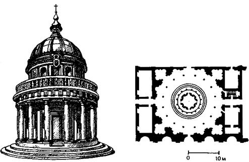 Рис. 3. Темпьетто во дворе церкви Сан-Пьетро ин Монторио. Рим. 1502 г. Общий вид. Разрез, план.