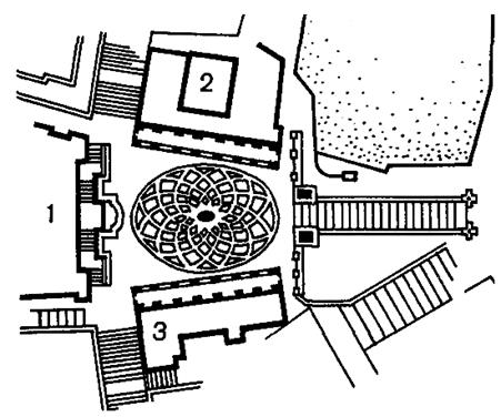 С открытием Америки (1492 г.) и. морского пути в Индию вокруг Африки (1498 г.) центр тяжести европейской экономики переместился в Испанию и Португалию. Необходимые условия для строительства сохранились только в Риме — столице католической церкви всей феодальной Европы. Здесь ведущим было строительство уникальных культовых сооружений. Развитие получает архитектура садов, парков, загородных резиденций знати. С Римом связана значительная часть творчества крупнейшего архитектора эпохи Возрождения—Донато Браманте. Темпьетто во дворе церкви Сан-Пьетро ин Монторио был построен Браманте в 1502 г. (рис. 3). Это небольшое произведение зрелой центричной композиции стало подготовительным этапом работы Браманте над планом собора св. Петра в Риме.
