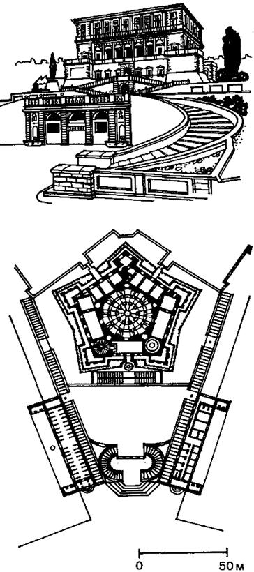 Рис. 6. Вилла Фарнезе в Напрарола. Перестройка 1559—1625 гг. Общий вид, генеральный план.