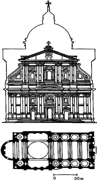 Рис. 7. Церковь Иль-Джезу в Риме. Нач. в 1568 г. Фасад, план.