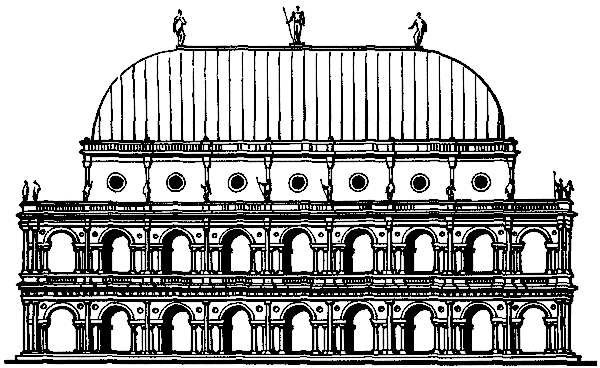 Купол после смерти Микеланджело в 1564 г. по его проекту и модели строили Джакомо делла Порта и Доменико Фонтана. Изменена была только конструкция: вместо запланированной Микеланджело тройной оболочки была принята двойная. Смелые искания Микеланджело оказали огромное влияние на последующую архитектуру Италии. В отличие от уравновешенных композиций классической архитектуры его произведения основаны на усилении динамики формы, объема и пластической обработки. Джакомо Бароцци да Виньола уже зрелым архитектором (он спроектировал дворец Фонтенбло во Франции и работал на постройке ватиканского Бельведера) получает в 1559 г. заказ на перестройку виллы Фарнезе в Капрароле. Он реконструирует пятиугольный в плане замок, построенный по проекту Сангалло-младшего, и создает вокруг него целый парковый ансамбль (рис. 6). Работы были закончены только в 1625 г. Церковь Иль-Джезу в Риме, начатая Виньолой в 1558 г., знаменует собой начало возврата к композициям, главное в которых—фасадная плоскость, а структура всего пространства раскрывается изнутри (рис. 7). В этом—влияние готических приемов и соображения экономики (можно не заботиться о скрытых от зрителя боковых фасадах). Композиционные принципы, заложенные Виньолой в архитектуру церкви Иль-Джезу, стали основными в период барокко. Трактат «Правило пяти ордеров» принес ему большую известность как теоретику архитектуры, систематизировавшему законы пропорционирования античных сооружений. Андреа Палладио, внимательно изучавший античное наследие и продолжавший традиции Высокого Возрождения, работал главным образом в Виченце. В 1540 г. его проект побеждает на конкурсе по перестройке палаццо Публико. Готическое здание XV в., перекрытое сомкнутым сводом, Палладио окружает двухъярусными галереями, придавшими ему открытый, гражданский характер (рис. 8). Впечатление композиционной ясности, пластики, ажурности достигается свободной расстановкой арок и колонн большого ордера в сочетании с широким полем антаблемента.