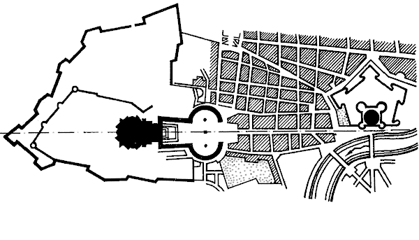 Ее решение усложняется все усиливающимся расслоением общества. На структуре города это отражалось в хаосе застройки кварталов жилища для простонародья с отдельными включениями дворцовых и культовых ансамблей. В эпоху Возрождения строительству городов уделяется особое внимание. Буржуазию не удовлетворяют кривые тесные средневековые переулки. Возникает идея города центричного типа, отражающего синтез рациональных форм римских военных лагерей с естественно развивавшимися концентрическими структурами городов средневековья. Теоретическую основу социальной структуры новых городов пытались создать философы-утописты Томас Мор, Томмазо Кампанелла. А. Филарете в проекте идеального города Сфорцинда впервые предлагает заменить прямоугольную планировочную структуру радиальной схемой уличной сети, обобщая, таким образом, опыт стихийной геометрии развития средневековых европейских городов. В разработках Л. Альберти город насыщается воздухом, зеленью, ощущением пространства. Город понимается как демократическая формация, но делится на кварталы по классовой принадлежности. А. Палладио переоценивает структуры города с позиций барокко. Он предлагает поместить княжеский дворец в центре города, закладывая тем самым основы дворцовых лучевых композиций. Интерес к городскому пейзажу, повседневному быту горожан стимулировал развитие перспективной живописи, жанровых композиций, искусства Возрождения в целом. Некоторые идеальные города были построены: Пальма Нуова по плану Скамоцци (1583 г., рис. 13); Ливорно и Фесте-Кастро в XV в. (арх. Сангал-ло) —эти города не сохранились; Ла Валетта (1564 г.) и Граммикеле (1693 г.). Другой стороной практического градостроительства, реализующего новые принципы в уже сложившихся городах, было создание в аморфной городской среде композиций, ставших впоследствии очагами городских ансамблей. Барокко привлекает пейзаж в качестве одного из основных компонентов городского ансамбля. Продолжается архитектурное формирование городских центров. При этом площадь утрачивает функциональное и демократическое содержание, присущее ей в эпоху раннего средневековья (место торговли, народных сборищ). Она становится украшением города, его парадной частью, скрывающей стихию внутриквартальной застройки. Улицам в эпоху Возрождения не уделялось много внимания. В период барокко главные улицы прокладываются в виде широких проспектов (Виа Корсо в Риме, выходящая на площадь дель Пополо). Ансамбль площади дель Пополо представляет пример трехлучевой композиции, иллюстрирующей принципы барокко в градостроительстве. Две церкви, построенные во время, реконструкции площади, рассекают городское движение на три русла и ориентированы апсидами не на восток, а в соответствии с градостроительным замыслом, входом на север. В архитектуре Возрождения большое значение приобретает разработка проекта с позиций теоретической механики, его инженерное обоснование. Происходит дифференциация работы проектировщика и строителя. Архитектор теперь осуществлял руководство стройкой, но не являлся одним из мастеров, непосредственно участвующих в работе. Вместе с тем он не только детально прорабатывал весь проект, часто на модели, но и продумывал ход строительных работ, использование строительных механизмов для подъема и монтажа. Возвраще