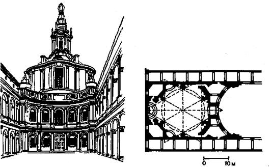 Для барокко характерны усложненность планов, пышность интерьеров с неожиданными пространственными и световыми эффектами, обилие кривых, пластично изгибающихся линий и иоверхностей; ясности классических форм противопоставляется изощренность в формообразовании. В архитектуре широко используются живопись, скульптура, окрашенные поверхности стен. В 1614 г. заканчиваются, наконец, работы по строительству собора св. Петра. Доменино Фонтана и Карло Мадерна удлиняют восточную ветвь плана и достраивают внушительных размеров вестибюль. При высоте внутреннего пространства собора до отверстия светового фонаря в 123,4 м и диаметре купола 42 м длина главного нефа составила 187 м, ширина — 27,5, высота —46,2 м (рис. 10). В 1667 г. Джованни-Лоренцо Бернини, талантливый снульптор, сооружает колоннаду на площади перед собором, завершив формирование композиции площади. Совершенно иной по характеру работой Бернини является церковь Сант-Андреа в Риме (1670 г.)—одно из классических произведений барокко. При сооружении парадной лестницы у Сикстинской капеллы («скала Реджиа») Бернини использовал эффект оптической иллюзии, сужая ширину маршей по направлению к верхней площадке. Крупнейшим архитектором итальянского барокко был Франческо Бор-ромини, построивший церковь Сан-Карло у Четырех фонтанов (нач. в 1638 г.) и Сант-Иво во дворе университета в Риме (1660 г.). Обе церкви небольшие с центричным, прихотливым в плане внутренним пространством (рис. 11). Период барокко богат значительными градостроительными работами, к числу которых можно отнести площадь Пьяцца дель Пополо, начатую в 1662 г. архитекторами К. Райнальди и Д. Фонтана. Характерные примеры ансамблевой композиции позднего барокко — Испанская лестница (А. Спекки и Ф. да Санкти, 1725 г.), ведущая к собору Санта-Тринита деи Монти, а также ансамбль палаццо Поли со знаменитым фонтаном Треви перед ним (Н. Сальви, 1762 г.).