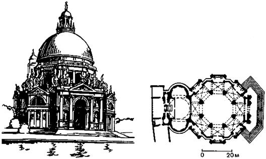 В последней работе с исключительным мастерством решен синтез архитектуры и скульптуры и достигнут эффект театрального действия, в котором скульптуры как бы «выступают» на фоне архитектурной декорации. В обоих примерах средствами динамичного сопоставления масс и поверхностей решается задача архитектурной организации пространства. Загородные виллы эпохи барокко отличаются осевым построением композиции, большую часть которой занимает обширный регулярный парк с беседками, фонтанами, каскадами водопадов, широкими лестницами. Наиболее интересные из них — вилла д"Эсте в Тиволи, начатая в 1549 г. Ли-горио, и вилла Альдобрандини во Фраскати (Джакомо делла Порта, 1603 г.). Кроме Рима великолепные произведения барокко были созданы в Венеции. Лучшая работа Бальдассаре Лонгена — церковь Санта-Мария делла Салюте (1682 г.) на стрелке Большого канала — живописная центричная восьмигранная постройка с куполом, барабан которого поддерживают мощные волюты (рис. 12).