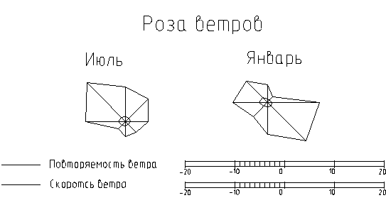 При разработке ГП учитывалось воздействие ветров, то есть скорость ветра и его направление. Эти параметры определяются по СНИП 23-01-99 «Строительная климатология» при построении розы ветров для января и июля. Скорость ветра в пределах 2 – 6 м/с считается комфортной, более 6 м/с - создает условия дискомфортности. Здание на ГП расположено с учетом розы ветров за январь и июль месяцы для г. Братска, данные для построения которой были взяты из вышеуказанного СНиПа (см. рис. 1).