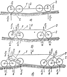 При жестком креплении ходовых колес (рис.2 а) за счет допустимых продольных и поперечных уклонов путей и неодинаковой жесткости основания кранового пути и самих рельсов может произойти перегрузка отдельных колес. При объединении колес в балансирные тележки (рис.2 б,в) нагрузка воспринимается всеми колесами. Для равномерного распределения этой нагрузки соотношение плеч рычагов-балансиров выбирают: для двухколесной тележки 1:2, для трехколесной 1:3 и т.п..