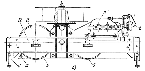 1 – электродвигатель; 2 – тормоз; 3 – редуктор; 4 – ведущая шестерня открытой передачи; 5,6 – колеса; 7,9 – зубчатые венцы колес; 8 – промежуточная (паразитная) шестерня; 10 – рычаг конечного выключателя; 11 – рельсовый откидной захват; 12 – рама; 13 – кожух колеса.
