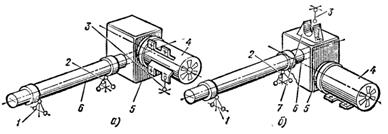Механизм передвижения кранов серии КБ. Унифицированные механизмы передвижения бывают двух типов: тип I – для кранов, не имеющих ходовых тележек, с креплением механизма непосредственно на металлоконструкциях ходовой рамы и тип II – в виде отдельных ходовых тележек. В обоих случаях крепление механизма передвижения выполняется самоустанавливающимся по трехопорной схеме (рис.4 а,б). Двумя опорами 1 и 2 являются подшипники, поддерживающие выходной вал редуктора. Один подшипник зафиксирован в осевом направлении. Третьей опорой 3 служит лапа электродвигателя 4 или проушина 7. Эта опора обеспечивает восприятие крутящего момента и удерживает механизм от проворачивания вокруг выходного вала 6 редуктора 5.