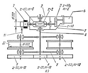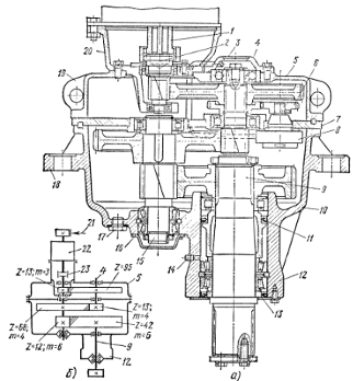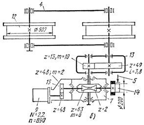 На втором конце промежуточного вала закреплена на шпонке или шлицах ведущая шестерня 8 открытой передачи. Две ведомые шестерни 9 посажены на вал ходовых колес. Таким образом, оба ходовых колеса ведущие.