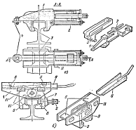 В настоящее время на многих кранах серии КБ установлены захваты тискового типа (рис.6 а). Эти захваты требуют применения для крановых путей специальных стыковых рельсовых накладок. Для работы с обычными железнодорожными накладками применяются полуавтоматические захваты (рис.6 б). Такой захват состоит из сварного корпуса 1 с бобышками 11, которыми он опирается на выступы в центральном проеме ходовой тележки. К корпусу шарнирно прикреплены рычажные губки 8 и 9, причем ось 10 их шарнира выбрана так, чтобы при восприятии отрывающей нагрузки губки не соскакивали с головки рельса. Для фиксации крана в нерабочем состоянии необходимо вставить клин 6 и затянуть болт 2. Для ускорения фиксации крана на путях в настоящее время применяют полуавтоматические захваты без съемных клиньев 6 и болтов 2, но с клиньями 12, подставляемыми под колеса (рис.6 в,г). Противоугонные клинья 12 тележек представляют собой металлический клин с приваренной ручкой. Во время работы крана клин располагается на металлоконструкции тележки, а для остановки крана и закрепления его в нерабочем состоянии клин подводится под колесо 15.