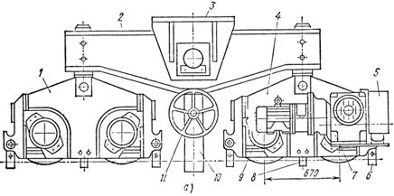 Механизм передвижения кранов типа БКСМ и кранов-погрузчиков КП-8 выполнен в виде двух ведомых (без привода) и двух ведущих (приводных) ходовых тележек (рис.3 а,б).