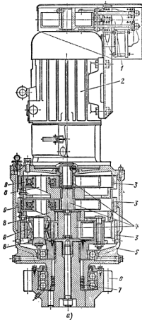 Механизмы поворота с вертикально расположенным двигателем более компактны, чем механизмы с горизонтально расположенным двигателем, поэтому они более распространены. К этому типу относятся все унифицированные механизмы поворота, а также усовершенствованная конструкция механизма поворота крана МСК-5-20 (рис.8).