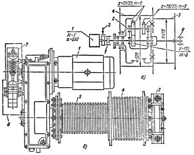 б – кинематическая схема лебедки с тормозным генератором;