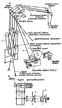Изменение вылета крюка у кранов с грузовой тележкой достигается реверсивной электролебедкой и системой направляющих блоков с тяговыми канатами, образующими бесконечную петлю, охватывающую направляющий блок, расположенный у оголовка стрелы. Концы канатов присоединены к барабану лебедки таким образом, что когда один конец навивается, то другой, наоборот, свивается, благодаря чему обеспечивается возвратно-поступательное перемещение грузовой тележки.