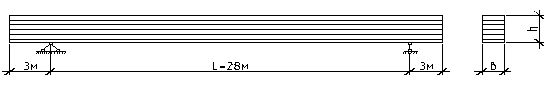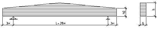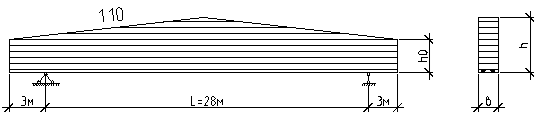 Клееная балка из прямолинейных элементов. Пролет 6…24м, k см = 4…6, k м = 0…1. Для пролета L=28м принимаем k см = 6, k м =1.