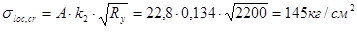 Применяемая сталь С-235 с расчетным сопротивлением изгибу Ry=2250 кг/м2 и расчетным сопротивлением сдвигу Rs=1300 кг/м2 .