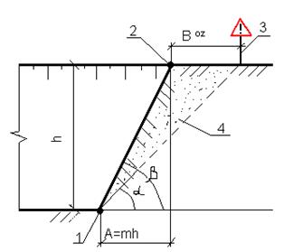1-нижняя бровка выемки; 2- верхняя бровка выемки; 3-граница опасной зоны; 4-призма обрушения; альфа-угол естественного откоса грунта; бетта- угол допустимой крутизны грунта откоса грунта; А-заложение; m-показатель откоса.