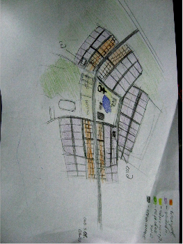 При выборе мест для застройки я пользовался анализом рельефа и размещал жилищную зону в наиболее благоприятной части. Я решил провести сквозную главную улицу через середину посёлка и вынес на её характерные блокированные здания, секционные дома, здания общественного пользования и церковь. Церковь расположена при помощи эффекта направления взгляда зрителя на характерную точку. Так как церковь в нашем посёлке является одной из доминант то наша главная дорога идущая от магистрали не меняет своего направления до церкви, так мы добиваемся направления,, гостей” нашего посёлка в общественный центр, от куда собственно и можно попасть в нужную часть посёлка по дорогам, расположенным наиболее функционально на мой взгляд. Парк я решил вывести к реке, чтобы люди гуляющие по нему могли насладится не только различными породами деревьев, но и прогуляться по берегу. Я решил слегка уйти от строгой формы посёлка, но есть две стороны медали нашего задания. Можно задать любую форму нашему посёлку но вопрос стоит скорее не форме посёлка а в том как всё функционально расположено. Вид со спутника как показывает практика не даёт никакого эстетического наслаждения от созерцания форм городов и посёлков.