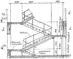 Марши и площадки ограждаются перилами высотой 0.9м; высота проходов под площадками и маршами делается не менее 2м; лестничные клетки должны иметь естественное освещение.
