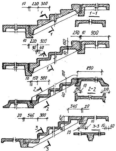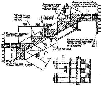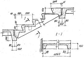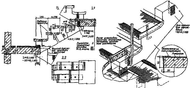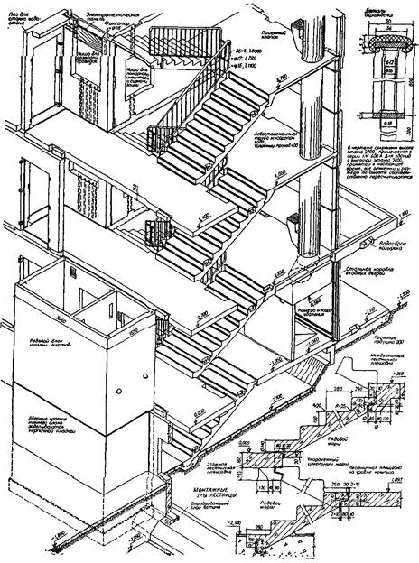 Железобетонные лестницы из крупноразмерных элементовполучили очень широкое распространение. Элементы (марши и площадки, изготовленные на заводе) лестниц краном устанавливаются на место и скрепляются сваркой закладных деталей.. Такие лестницы изготавливаются или с фактурными поверхностями ступеней и площадок или с накладными проступями (рис. 106, 107, 109).