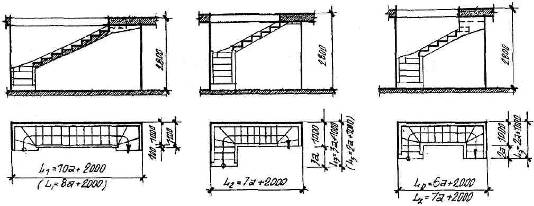 Примечания: 1. внутриквартирные лестницы должны удовлетворять формуле 2b+а=60-64 см; величина 60-64см – размер среднего шага человека. 2. Рекомендуемый уклон лестницы – 1:1,5, что соответствует отношению b:а=16,6:25 (допускается максимальный уклон 1:1,25 см). 3. В скобках даны размеры для уклона 1:1,25. 4. Минимальная ширина марша равна 90 см. 5. высота проходов под лестничным маршем до низа выступающих конструкций не менее 200 см. |