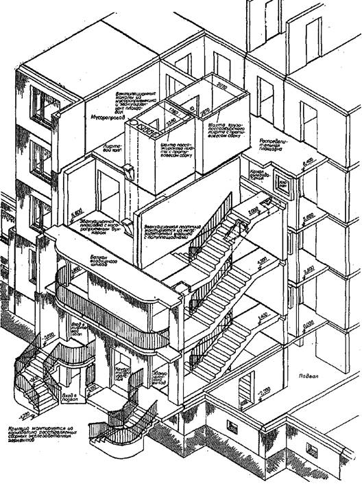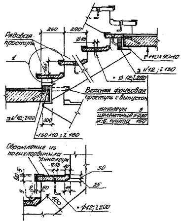 Сборная железобетонная: лестница из мелкоразмерных элементов: связь достигается сваркой закладных элементов. Ступени укладываются по косоурам на цементном растворе. Ограждения из стальных стоек (заделываемых в ступени) и наклонных решеток.