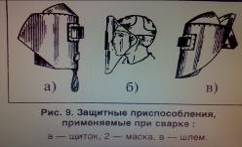 Ожоги. При сварке электродный металл и шлак разбрызгиваются; горячие брызги могут попасть на незащищенную кожу сварщика или вызвать тление и прогорание одежды, а тем самым ожоги. Для защиты от ожогов сварщиков обеспечивают специальной одеждой, обувью, рукавицами и головным убором. При работе с легковоспламеняющимися материалами может возникнуть пожар. Опасность пожара особенно следует учитывать при работе на строительстве. Если сварочные работы проводятся наверху, то необходимо находящиеся внизу аппаратуру и любые легковоспламеняющиеся материалы защищать от падающих сверху искр. Требуется также особая осторожность при сварке в тех случаях, когда около места выполнения работ располагаются деревянные леса или имеются отходы в виде стружки, опилок и т.д. Иногда для выполнения сварочных работ требуется обязательное разрешение пожарной охраны. В местах электросварочных работ должны быть средства пожаротушения в виде подведенной воды, ящика с песком, щита с инструментом (топор, лом, багор, лопата и т.п.) и огнетушителей.
