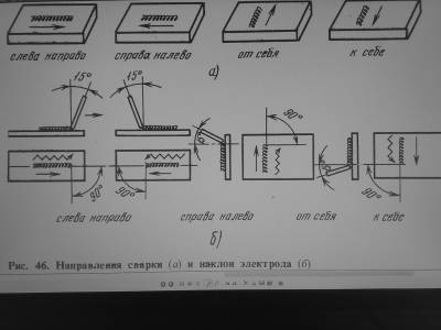 Независимо от направления сварки положение электрода должно быть определенным: он должен быть наклонен к оси шва так, чтобы металл свариваемого изделия проплавлялся на свариваемую глубину. Для получения плотного и ровного шва при сварке в нижнем положении на горизонтальной плоскости угол наклона электрода должен быть 150 от вертикали в сторону ведения шва.