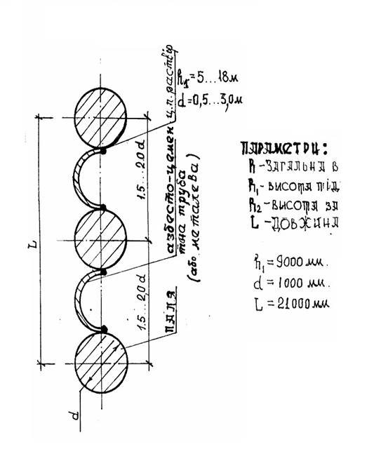Гибкие стеновые конструкции выполняют в виде стальных или железобетонных шпунтовых рядов, а также из буронабивных свай диаметром 600, 800, 1000 и 1200 мм длиной 30 м, расположенных в один или два ряда с расстоянием между сваями в ряду (в свету) от 0,5 до 1 диаметра сваи.