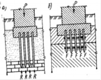Сваї-стійки (рис 1. а) передають основне навантаження (більше 70…80%) торцьової поверхні сваї. Ці сваї забивають до прочних грунтів. Висячі сваї (рис 1. б) основне навантаження (до 70…80%) сприймають через сили бокового тертя між зовнішньою поверхнею сваї і грунтом.