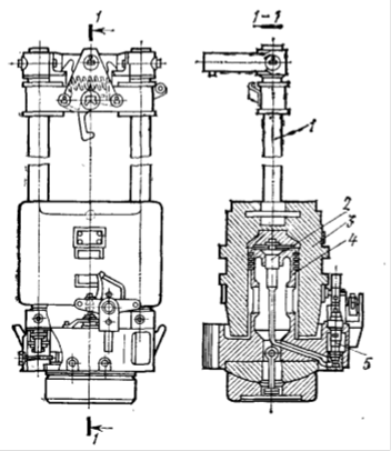 В результаті розширення газів циліндр підкидається вверх і цикл повторюється. Подача палива здійснюється насосом 5, котрий приводиться в рух падаючим циліндром. Тиск, що передається поршню при падінні циліндра, використовується для забивки сваї. Дизель-молот підвішений на канаті копрової установки, котрий під час роботи вісить вільно. Падаючий циліндр рухається по двум напрямним штангам 1. Для запуску Рисунок 1.2.1 Штанговий дизель-молота циліндр дизель - молот піднімається за допомогою троса і лебідки, і підвішується на крюку, що закріплений на верхній траверсі.