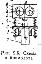 Двухвальний електричний вібромолот, схема котрого показана на рис.1.2.3, складається з ударної частини 8, підвішеної на наголівнику 3 за допомогою пружин 2, розміщених симетрично осі ОХ. В ударній частині вбудовані два однаково розміщених електродвигуна, ротори 7 котрих синхронно обераються в протилежні сторони навколо паралельних осей. На кінцях валів роторів насаджені делебанси 6. Оскільки проекції центрів мас обох обертових частин на ось ОХ постійно співпадають, обертання делебансів збуджує коливання ударної частини вздовж осі ОХ. Ці коливання чергуються з ударами ударника 5 в на ковальню 4 наголовника, котрий жорстко закріплений на сваї.