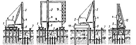 1 - підмости; 2 - стріловий крап; 3 - копрова стріла; 4 - молот; 5 - підбабок; 6 - свая: 7 - шпунт: 8 - розпорка: 9 - портальний кран; 10 - стойки; 11 - самопідйомна платформа; 12 - копер; 13 - направляючий каркас.