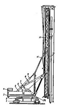 Самоходний копер складається із ходової частини, на якій встановлена поворотна чи неповоротна рама з розміщеними на ній механізмами підйому молота, "кошки" і сваї, а також копрової стріли (мачти), в якої є механізми зміни вильоту і нахилу (рис.2.2, 2.3).