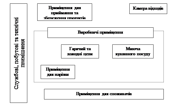 З урахуванням вимог технологічного проектування в них проектують групи приміщень: для прийому і збереження продуктів; виробничих; для споживачів; службових і побутових; технічних приміщень. Склад приміщень підприємства залежить від типу підприємства, потужності, а також від ступеня готовності одержуваних напівфабрикатів, кулінарних виробів і сировини.
