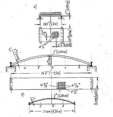 Рис. 1. Конструкции, испытывавшиеся на Московских бойнях в 1886 г.: а – железобетонная плита; б – железобетонный свод пролётом 7,5 м; в – то же, 4,26 м.