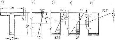 Рис. 3. Эпюры напряжений в расчетном сечении тавровой мостовой балки по А. Ф. Лолейту: а – габариты сечения; б, в – при расчетах по упругой стадии для разных значений n; г – с учетом гипотезы Консидера; д – по стадии разрушения.