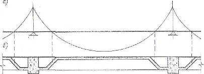 Рис. 4. Неразрезная тавровая балка, плита которой в пролетах и над опорами расположена в сжатой зоне: а – эпюра моментов; б – конструкция балки.