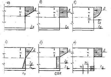 Рис. 8. Сравнительные эпюры напряжений в расчетных сечениях изгибаемой железобетонной балки: а - Лолейта; б — Казинчи; в — Столярова; г — Штаермана; д — Стафилевского; е — Гебауера.