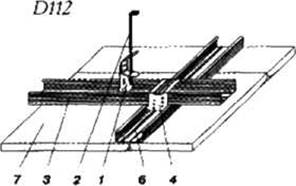 1 - підвіс з затиском; 2 - тяга; 3 - основний профіль (брусок); 4 - дворівневий з'єднувач; 6 - несучий профіль (брусок); 7 - ГКП
