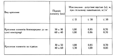Таблиця 1. Максимально допустимі відстані між точками кріплення каркасу стелі до перекриття
