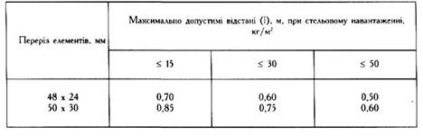 Таблиця 5. Максимальні допустимі відстані (І) між несучими елементами дерев'яного каркасу