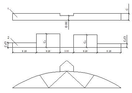 Рис. 4. Схема снеговой нагрузки. 1-первый вариант; 2-второй вариант загружения.