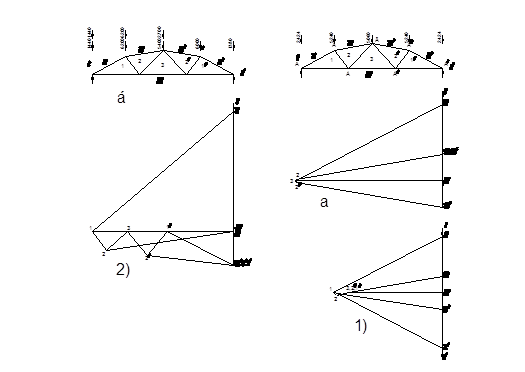 Рис. 6. Определение усилий в элементах фермы: а-загружения и диаграмма усилий от постоянной нагрузки; б-схема загружения снегом и диаграммы усилий; 1-от полного загружения снегом; 2-от одностороннего загружения снегом.