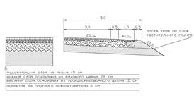 Тип дорожной одежды: капитальный. Конструкция дорожной одежды: плотный асфальтобетон 6 см., фракционный щебень 12 см., рядовой щебень 28 см., песчаный подстилающий слой 45 см.