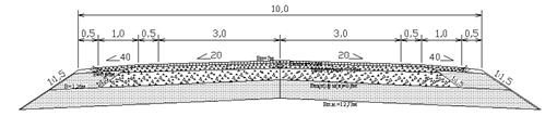 Техническая категория дороги IV, ширина земляного полотна 10 м., ширина проезжей части 6 м., ширина обочины 2 м., число полос движения 2, каждая по 3 м.