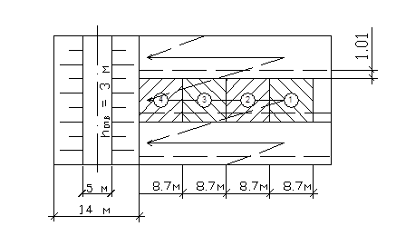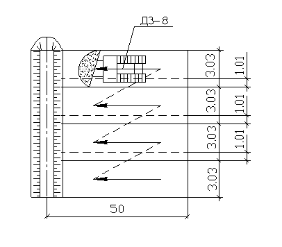 2) Два бульдозера разрабатывают и перемещают растительный грунт на середину захватки. В этом случае дальность перемещения не превышает 50м, поэтому бульдозеры разрабатывают и перемещают грунт без промежуточного вала.